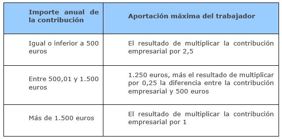 - Incremento en 8.500 euros. Es decir, el límite puede llegar a 10.000 euros. Siempre que tal incremento provenga de contribuciones empresariales, o de aportaciones del trabajador al mismo instrumento de previsión social (mismo plan de pensiones, plan de previsión social empresarial, mutualidad de previsión social, etc.) al que se han realizado las contribuciones empresariales, por importe igual o inferior a las cantidades que resulten del siguiente cuadro en función del importe anual de la contribución empresarial:
