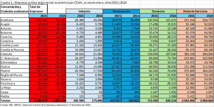 El tejido empresarial español está formado principalmente por pequeñas y medianas empresas. Según los últimos datos disponibles del Instituto Nacional de Estadística (INE), en 2024 había alrededor de 3,25 millones de empresas activas en España, de las cuales el 98,8% eran microempresas o empresas pequeñas, con entre 10 y 49 empleados, el 0,7% medianas, de entre 50 y 249 empleados. Las grandes empresas, con 250 o más empleados, representaban solamente el 0,1% del tejido empresarial español.
